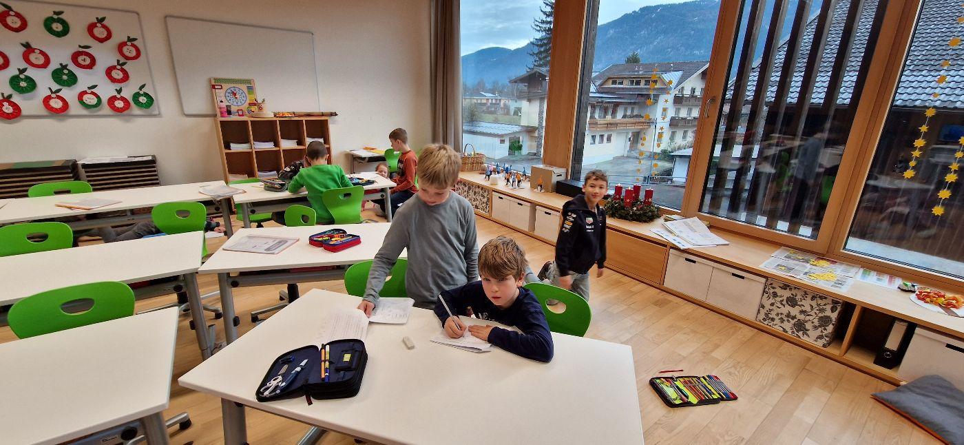 Während jeweils einige Kinder zum Backen an der Reihe waren, arbeiteten die anderen in den Klassenräumen und in unseren Lerninseln weihnachtliche Hefte aus.