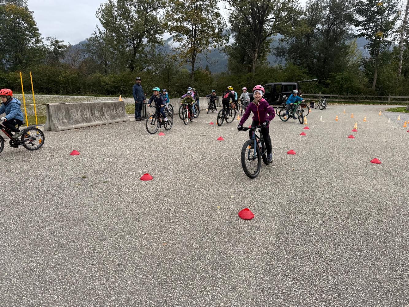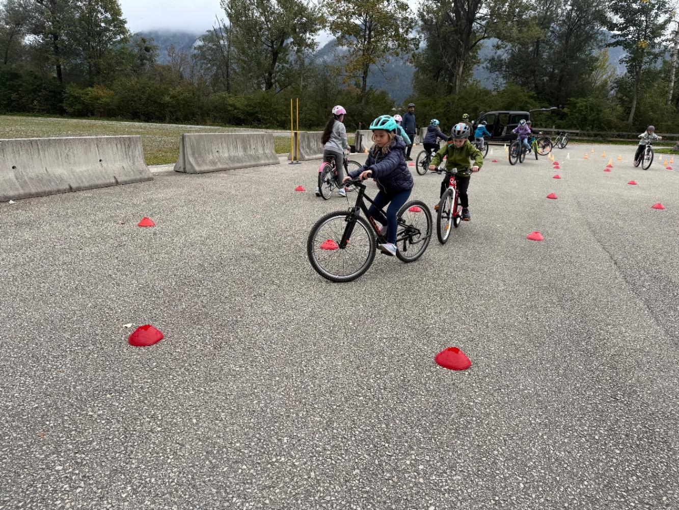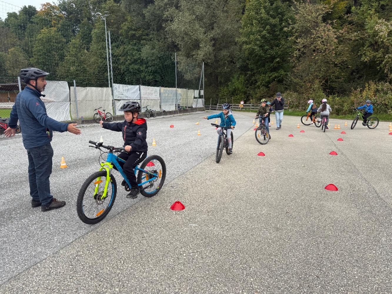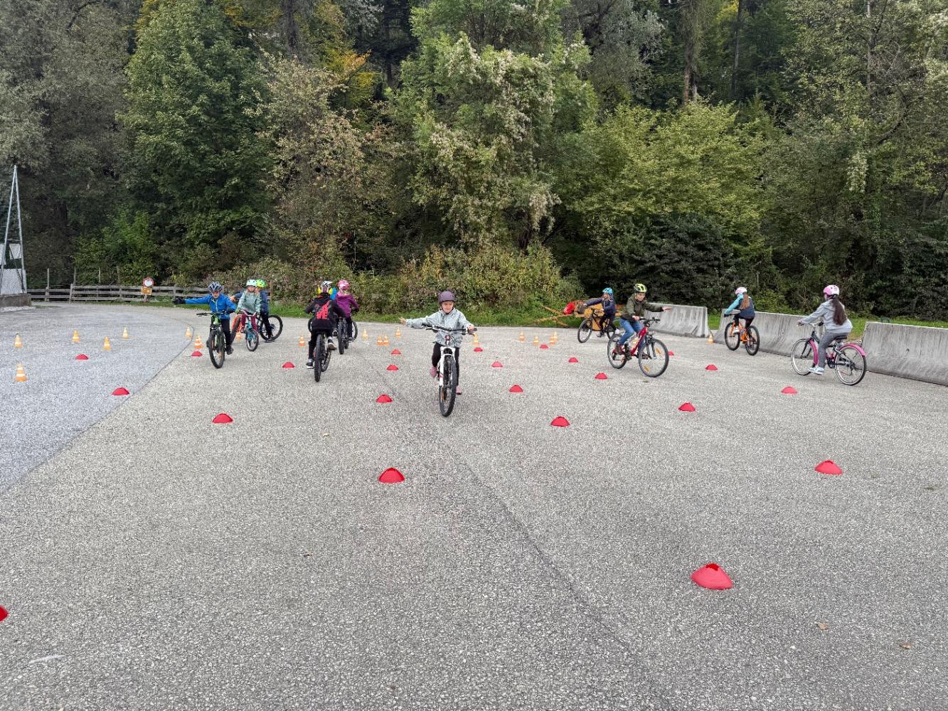 Die Kinder mussten mit den eigenen Fahrrädern einen kurvenreichen Parcours bewältigen, lernten das richtige Kurvenfahren und dabei wurden spezielle Aufgaben gestellt, wie z.B. einhändiges Fahren, zurückblicken beim Fahren und dabei eine Rechenaufgabe lösen, eine plötzliche Vollbremsung hinlegen oder stehend-Fahren. Es war ein sehr lehrreicher Vormittag mit vielen Verbesserungen der Technik, der den Kindern großen Spaß machte.