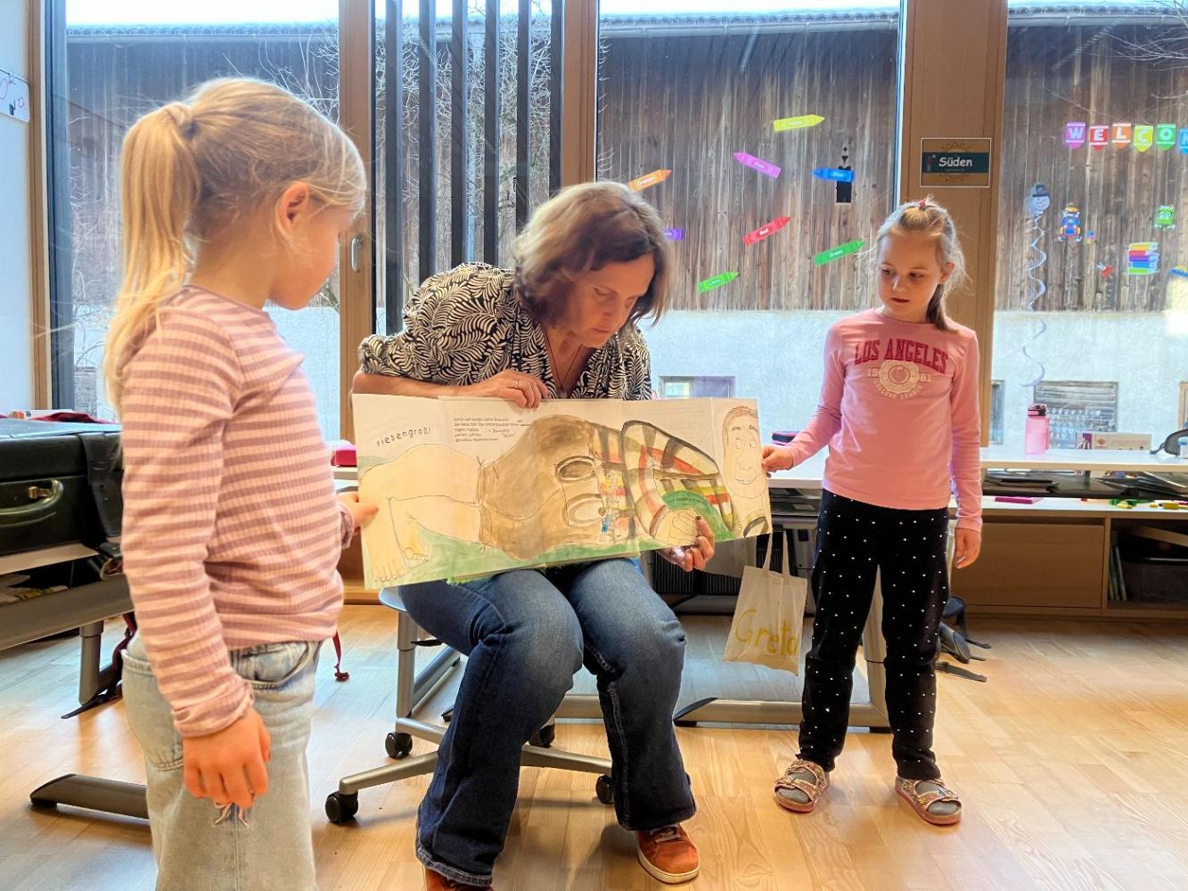 Während der Lesung hörten die Schülerinnen und Schüler aufmerksam zu und tauchten tief in die abenteuerliche Welt der Geschichte ein. Der Drache überraschte immer wieder mit neuen Fähigkeiten, was die Fantasie der Kinder anregte und für Staunen sorgte.