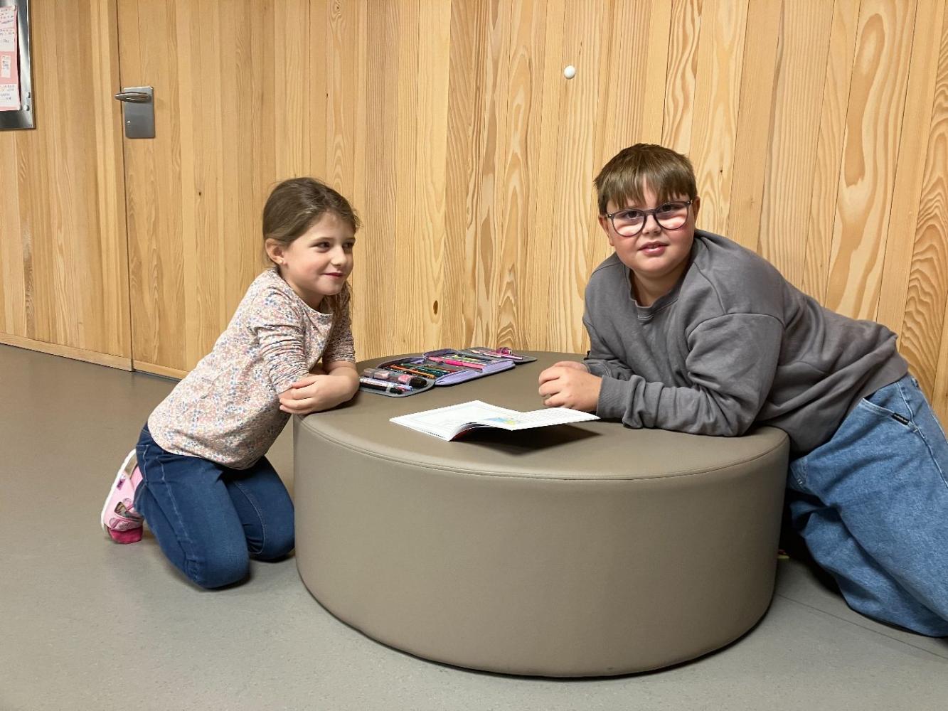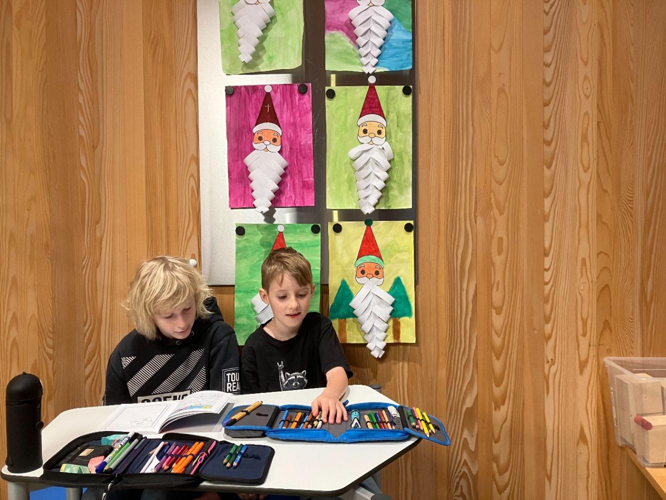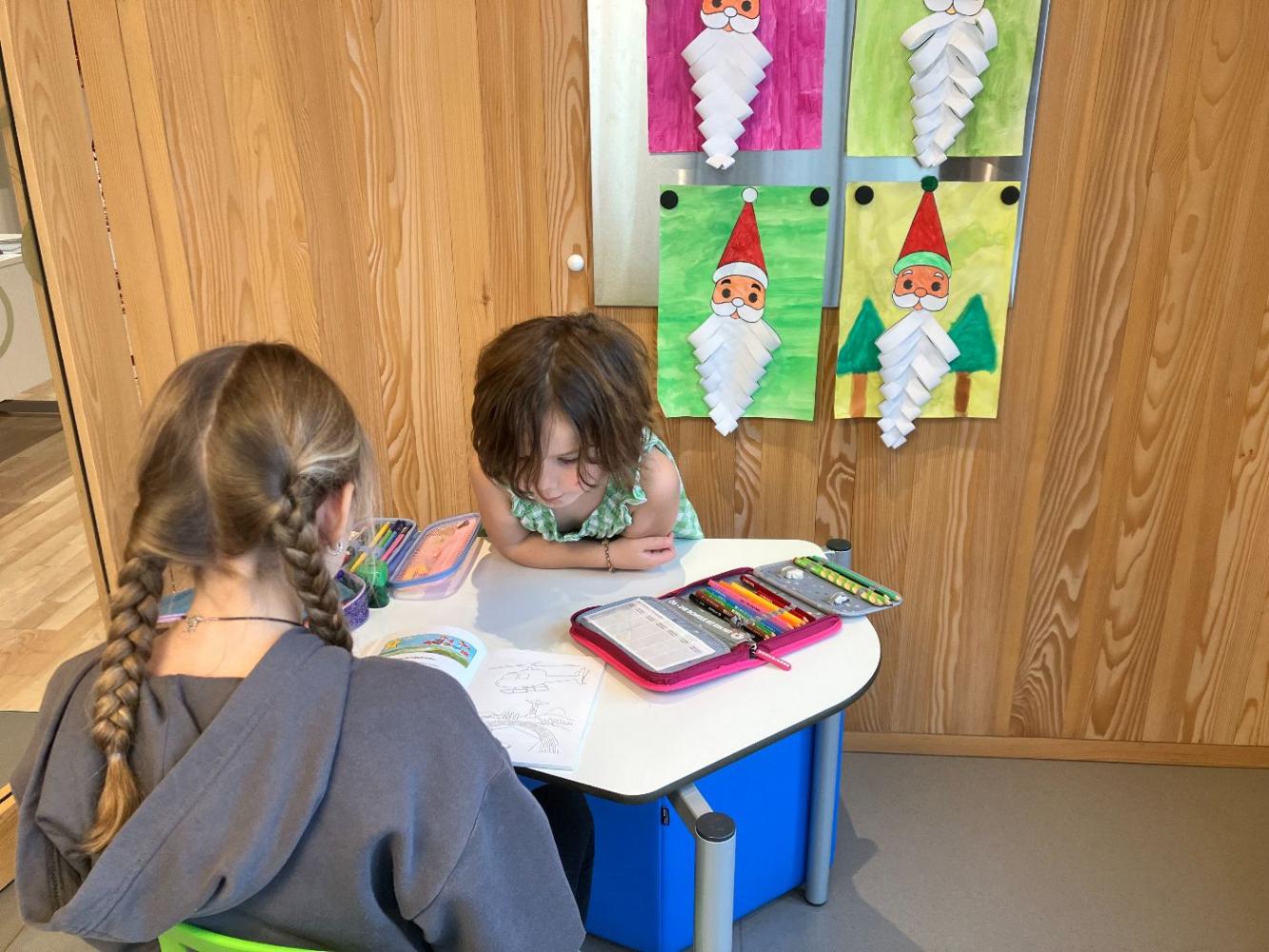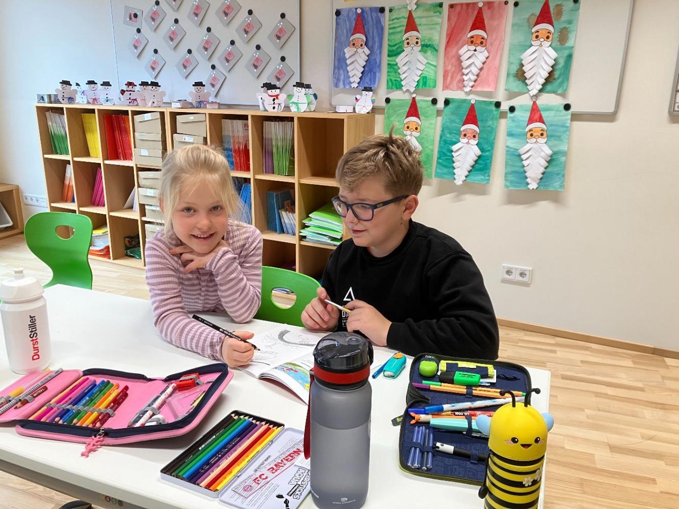 Im Dezember trafen sich die Klassen 1a und 4b jeden Tag für 15 Minuten zu einer gemeinsamen Weihnachtsaktion. Zusammen wurde an einem Weihnachtsbuch gearbeitet: Es wurde gelesen, gezeichnet, ausgemalt und spannende Rätsel gelöst. Die tägliche gemeinsame Zeit bereitete allen viel Freude und stärkte das Miteinander zwischen den jüngeren und älteren Schülerinnen und Schülern.